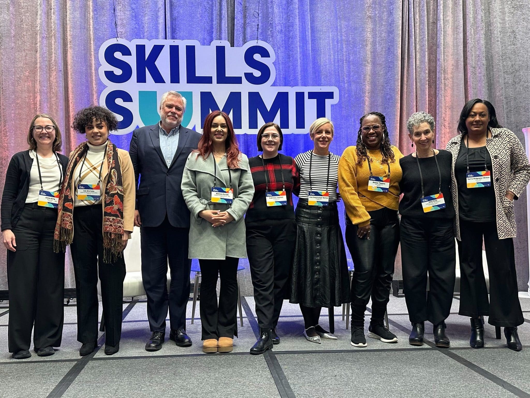 From left: Janna King (SEIU-UHW), Isis Orellana (California Workforce Association), Adam Peck (California Workforce Association), Melissa Gurule (JVS alum), Gabriella Jimenez (JVS), Lisa Countryman-Quiroz (JVS), Denise Thomas (JVS alum), Abby Snay (CA Labor & Workforce Development Agency), and Terrie Ridgeway-Olmos (SEIU-UHW) at the NSC Skills Summit in February.